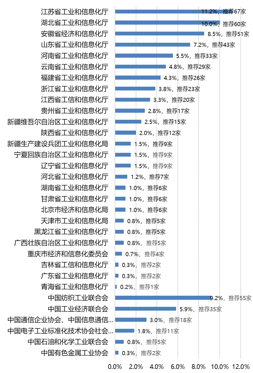 在推荐数量排名靠前的单位组织中,江苏省工信厅推荐企业数量67家;湖北省经信厅推荐企业数量60家;安徽省经信厅推荐企业数量51家;山东省工信厅推荐企业数量43家;河南省工信厅推荐企业数量33家;中国纺织工业联合会推荐企业数量55家;中国工业经济联合会推荐企业数量35家;剩余企业占比29%(见下图)。