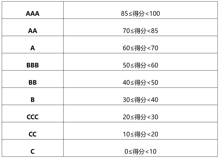 “2021工信千家优秀企业社会责任报告”集中发布各维度指标采用百分制(0~100分),将19项指标依次打分、评价,结合指标权重,加权分数为该报告的综合得分。各维度得分与综合得分均划分为九个等级,分别是AAA、AA、A、BBB、BB、B、CCC、CC、C(见下图)。