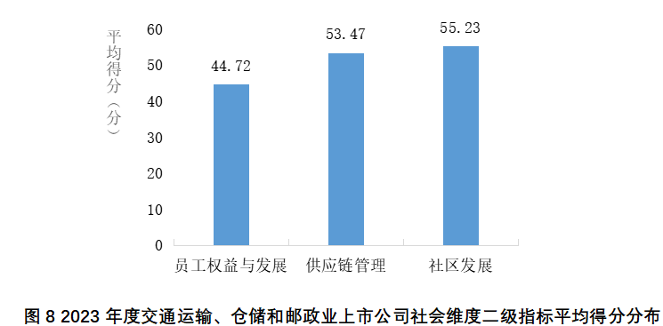 中国上市公司ESG评价的社会维度主要考察企业在员工权益与发展、供应链管理、社区发展方面的信息披露情况。2023年该行业整体社会维度的评价结果为BB级,较上一年度B级有所提升。交通运输、仓储和邮政业企业由于其服务属性与广泛的业务范畴,包括货物运输、旅客运输、仓储服务、快递服务等,成为连接生产者和消费者、城市和乡村、地区和国家之间的纽带,往往受到更大的利益相关方压力,企业普遍注重塑造和维护自身的社会形象。