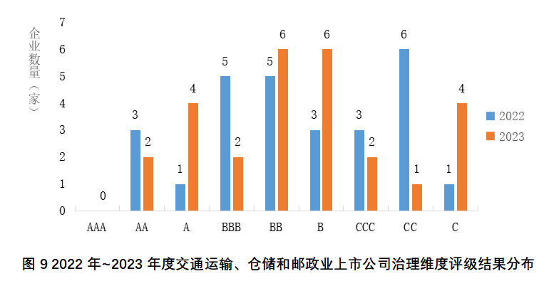 2023年27家交通运输、仓储和邮政业上市公司中,7家企业获评A~AA级,占比为25.93%;12家被评为B~BBB级,占比44.44%;8家企业评价结果处于C~CCC级,占比为29.63%。相较2022年,A级新增1家,C~CCC级减少一家,且半数以上企业为BBB级及以上,ESG整体表现水平有所提升。