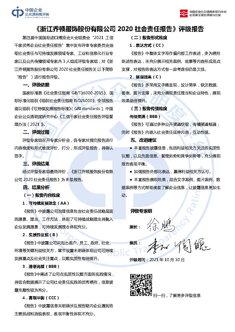 《浙江乔顿服饰股份有限公司2020社会责任报告》B