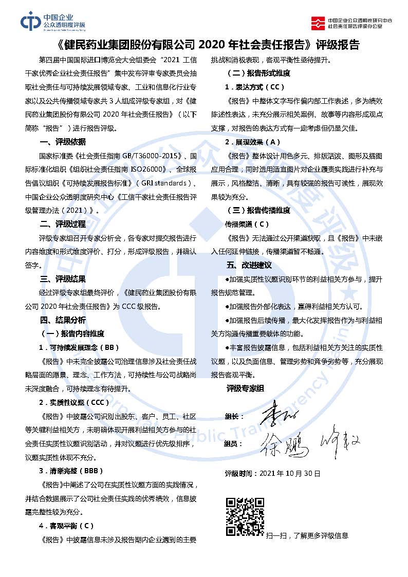 《健民药业集团股份有限公司2020年社会责任报告》CCC