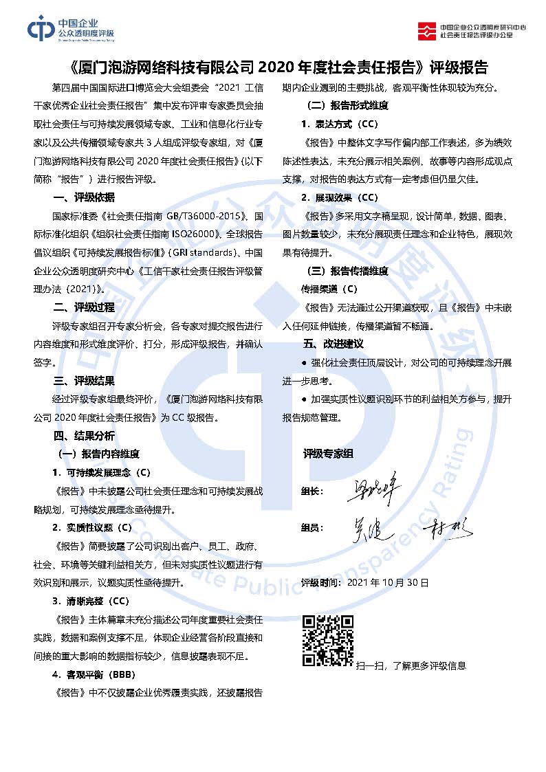 《厦门泡游网络科技有限公司2020年度社会责任报告》CC