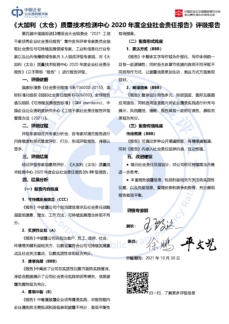 《大加利(太仓)质量技术检测中心2020年度企业社会责任报告》BB