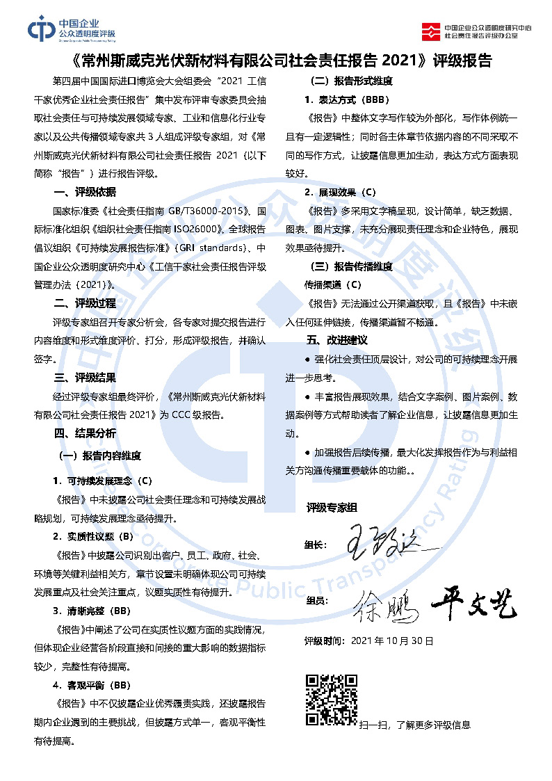 《常州斯威克光伏新材料有限公司社会责任报告2021》CCC