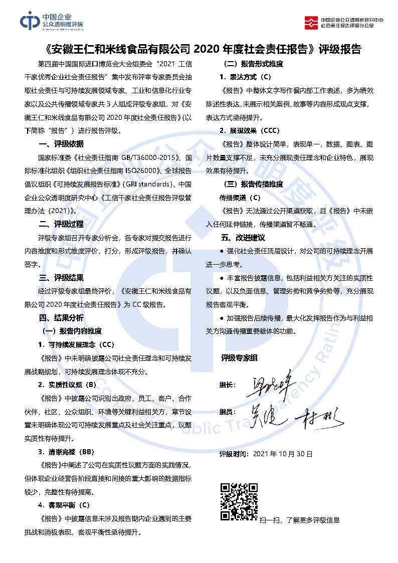 《安徽王仁和米线食品有限公司2020年度社会责任报告》CC