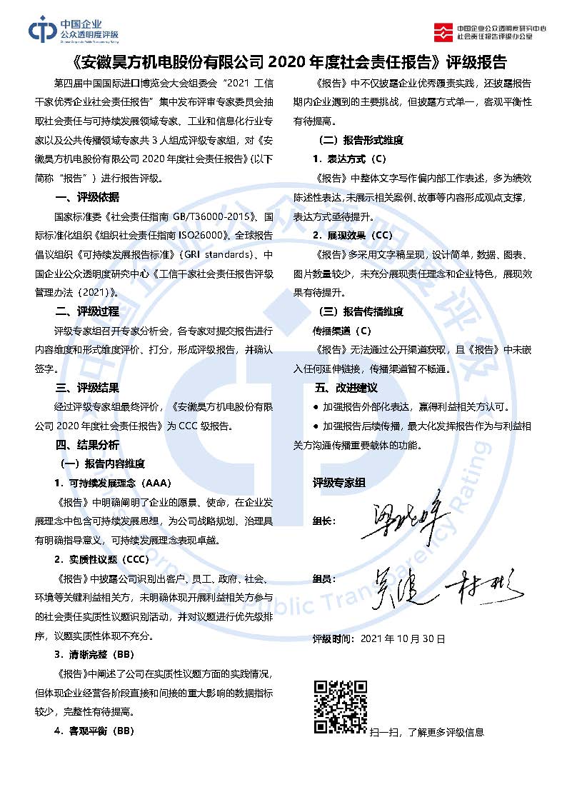 《安徽昊方机电股份有限公司2020年度社会责任报告》CCC