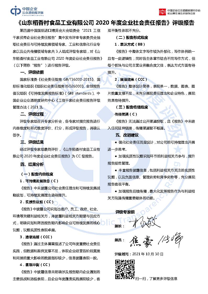 《山东稻香村食品工业有限公司2020年度企业社会责任报告》CC