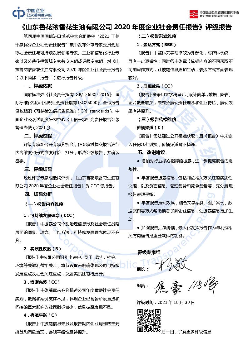 《山东鲁花浓香花生油有限公司2020年度企业社会责任报告》CCC