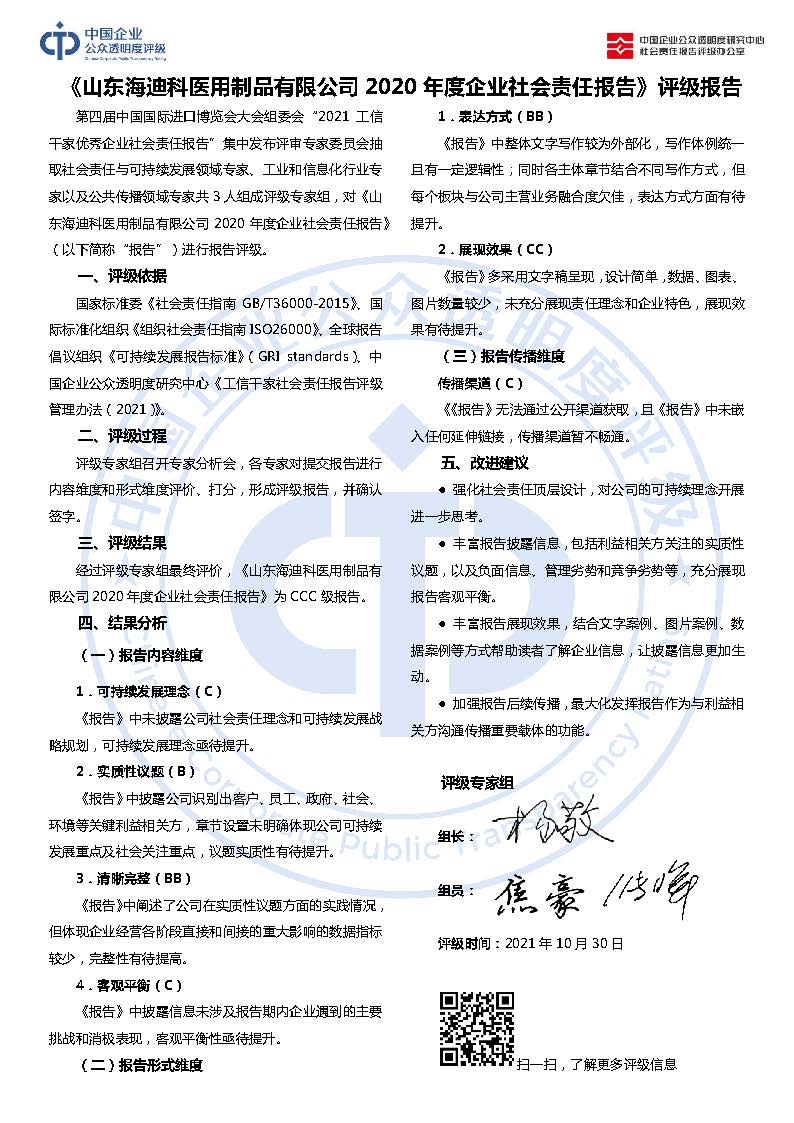 《山东海迪科医用制品有限公司2020年度企业社会责任报告》CCC