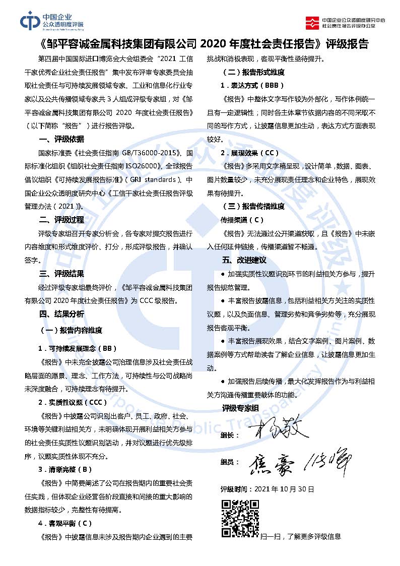 《邹平容诚金属科技集团有限公司2020年度社会责任报告》CCC