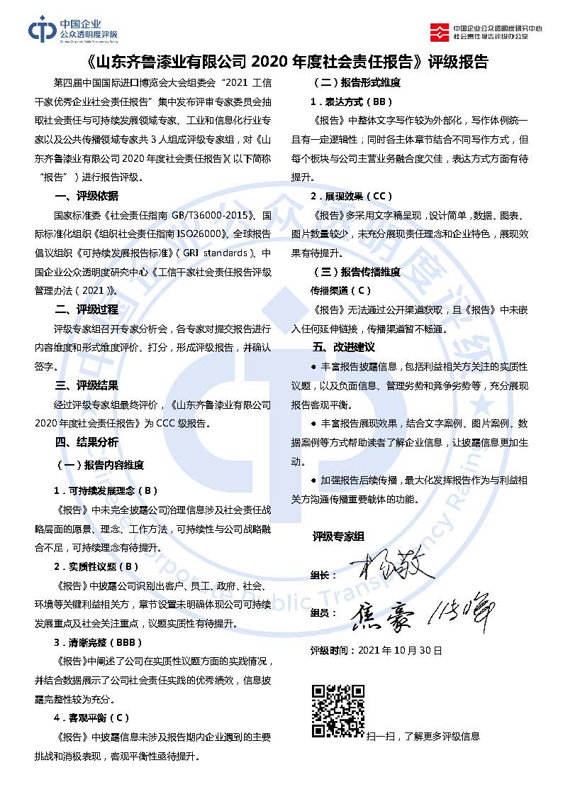《山东齐鲁漆业有限公司2020年度社会责任报告》CCC