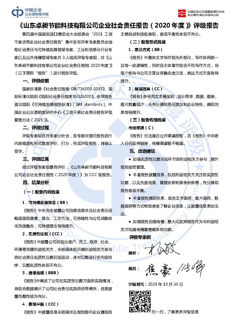 《山东卓昶节能科技有限公司企业社会责任报告(2020年度)》CCC